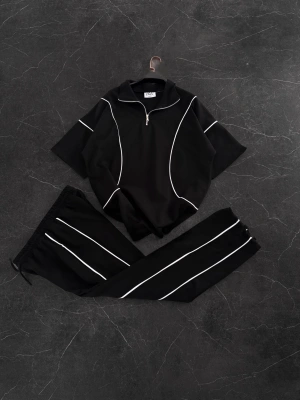 Biyeli Paça Lastik Şardonlu Eşofman Takımı-Siyah